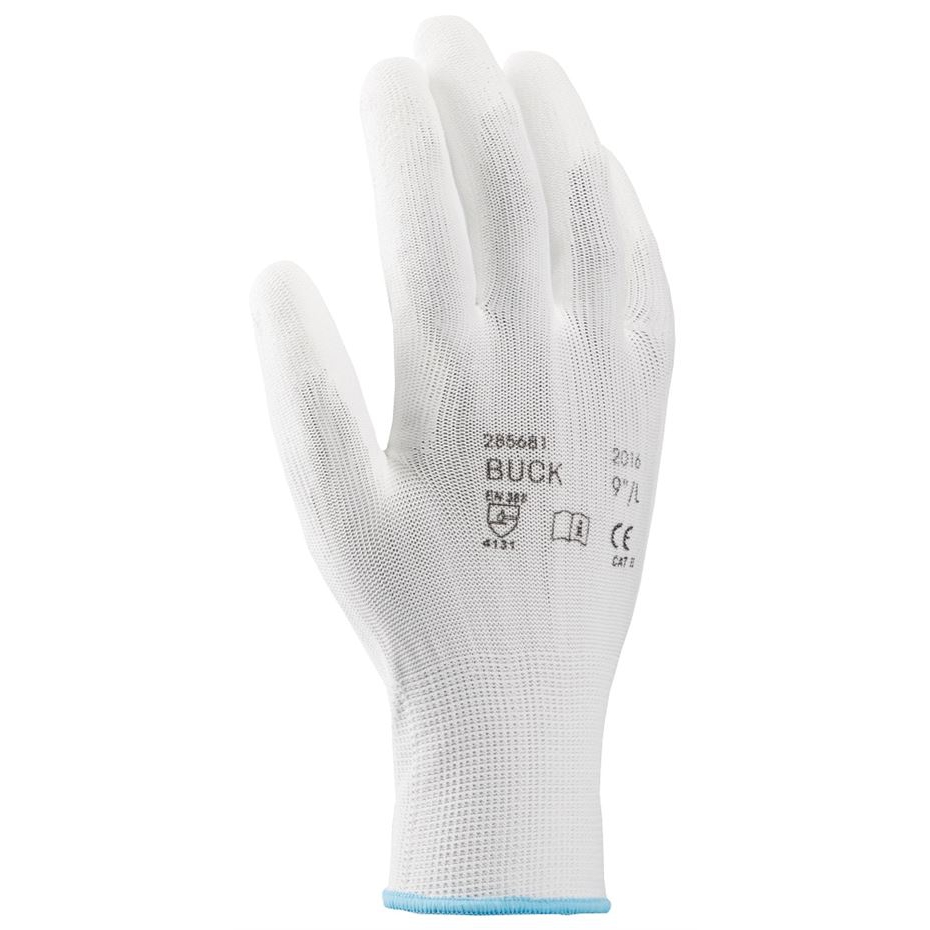 Rukavice BUCK efektivně kombinují polyester a polyuretan způsobem, že jemný úplet polyesterových vláken impregnují máčenou vrstvou polyuretanu. Materiál rukavice je pružný, snadno se obléká a skvěle se přizpůsobí po celé délce jednotlivých prstů i v obvodu dlaně. Polyuretanová vrstva pokrývá spodní část prstů a dlaň a zlepšuje pevnost úchopu, zabraňuje sklouznutí drženého předmětu nebo nářadí. Zároveň účinně předchází poranění jemné pokožky rukou. Polyuretan využívá výhody ve vysoké odolnosti vůči otěru. Pružný materiál vytvoří dostatečnou izolační vrstvu mezi pokožkou a vnějšími vlivy. Do jisté míry dobře brání nejen mechanickému poranění, ale i potřísnění nebo zašpinění. Vrstva rukavic ruce spolehlivě ochrání, ale zároveň vytváří pouze tenkou bariéru, aby příliš neomezila ohebnost prstů nebo citlivost.