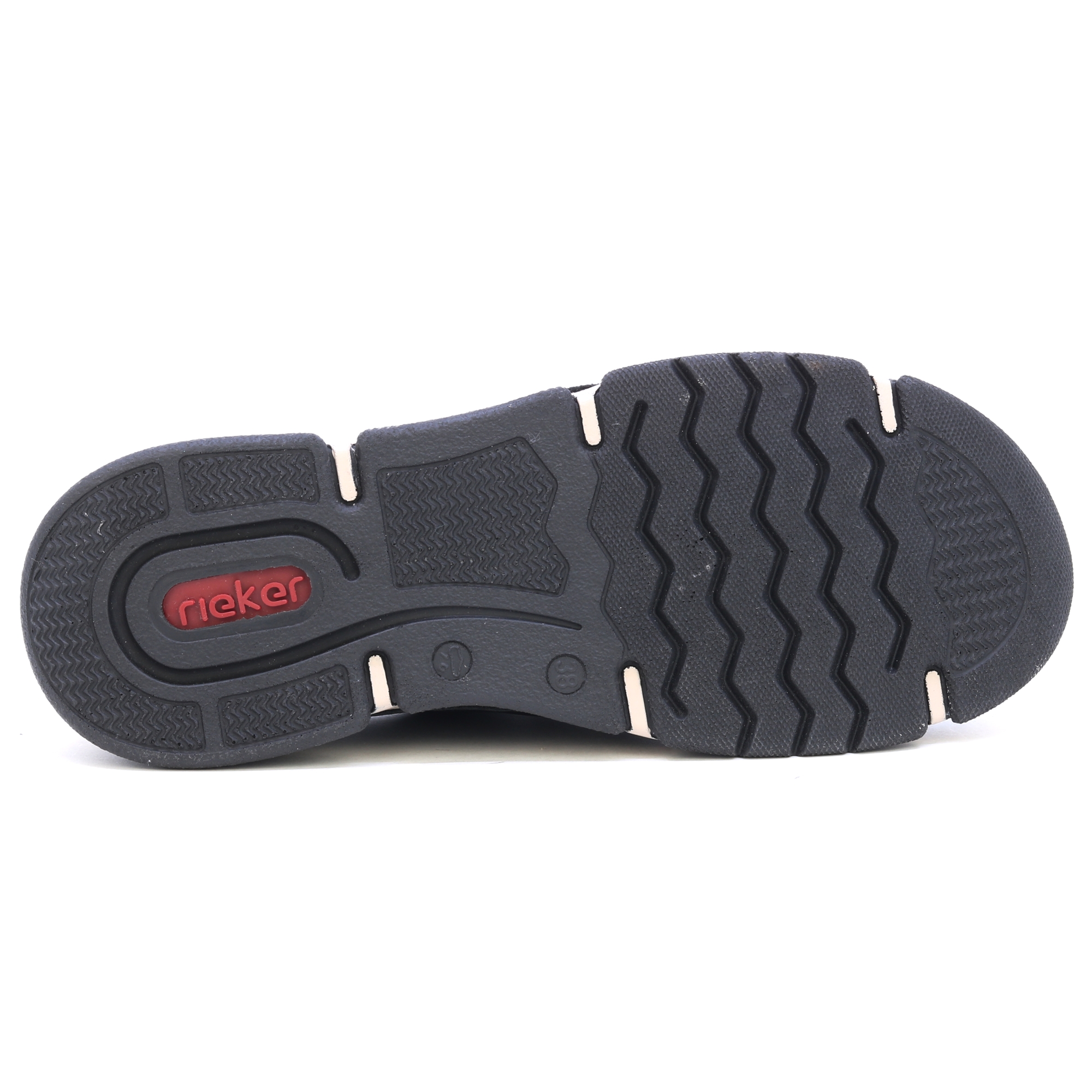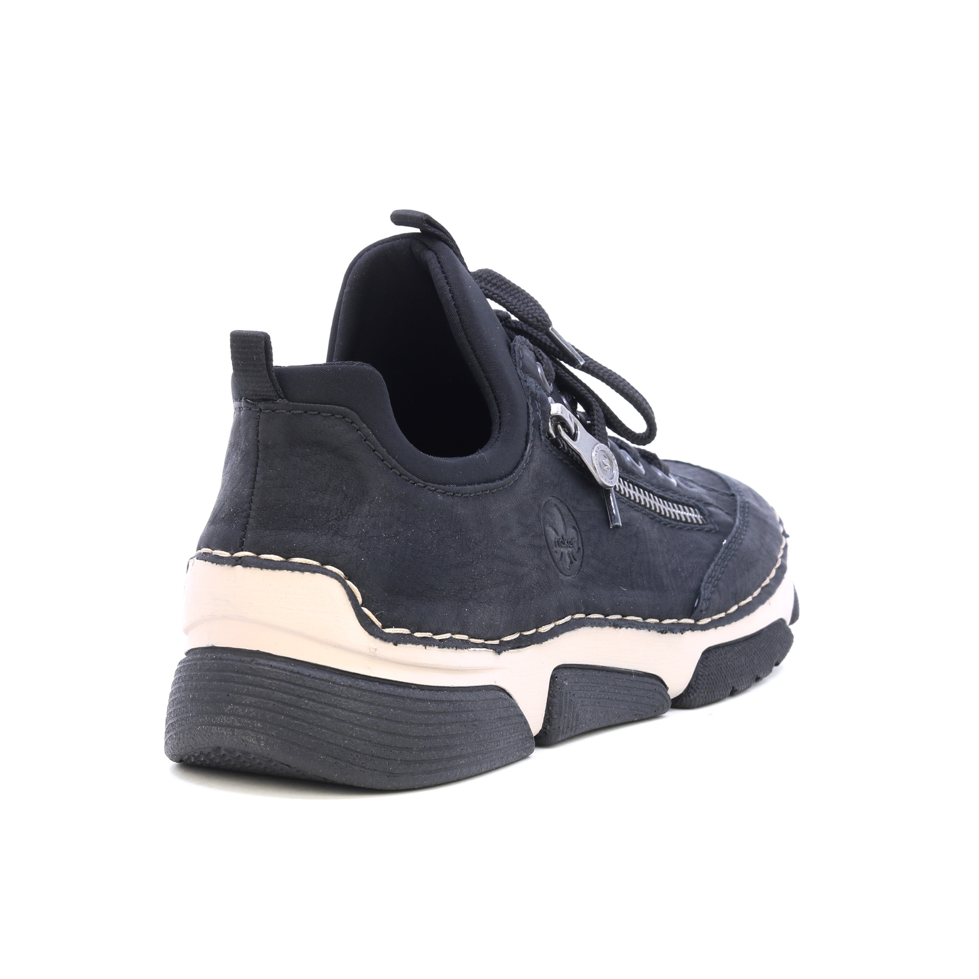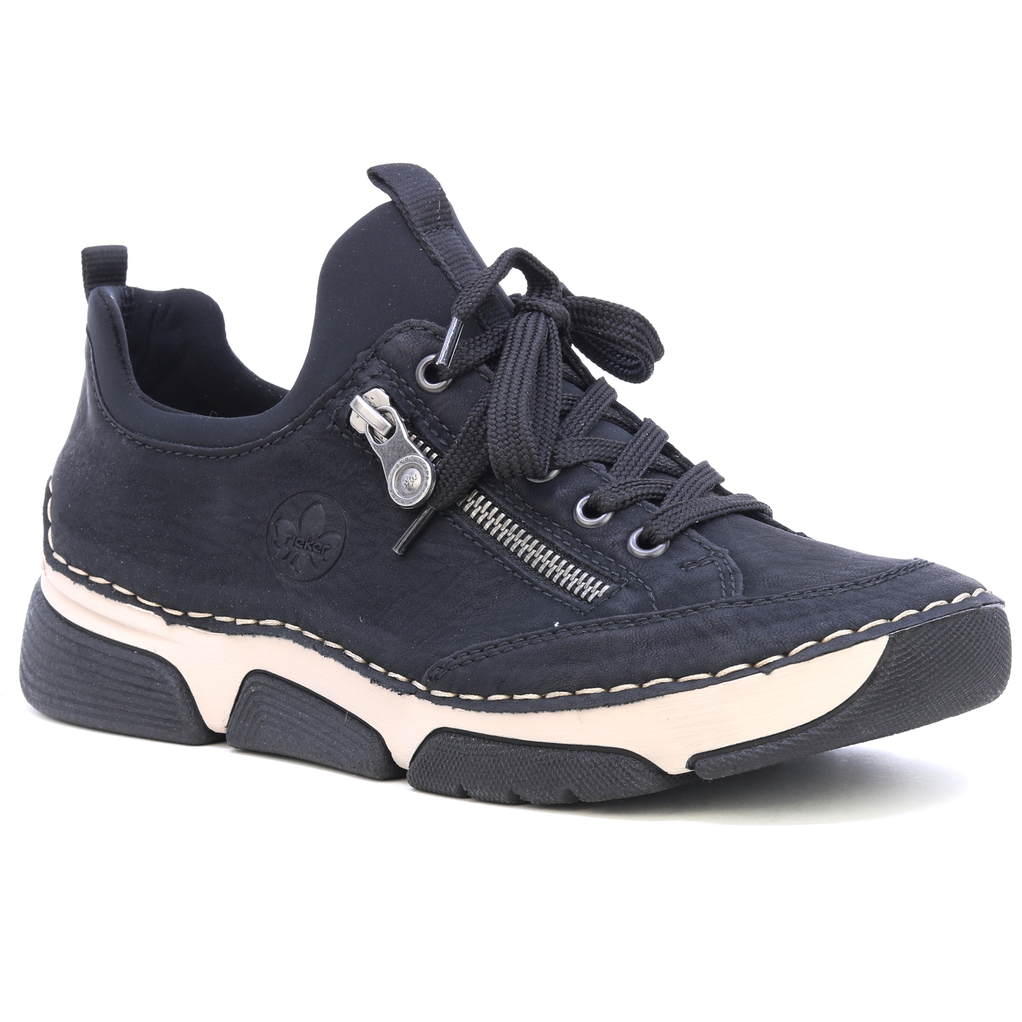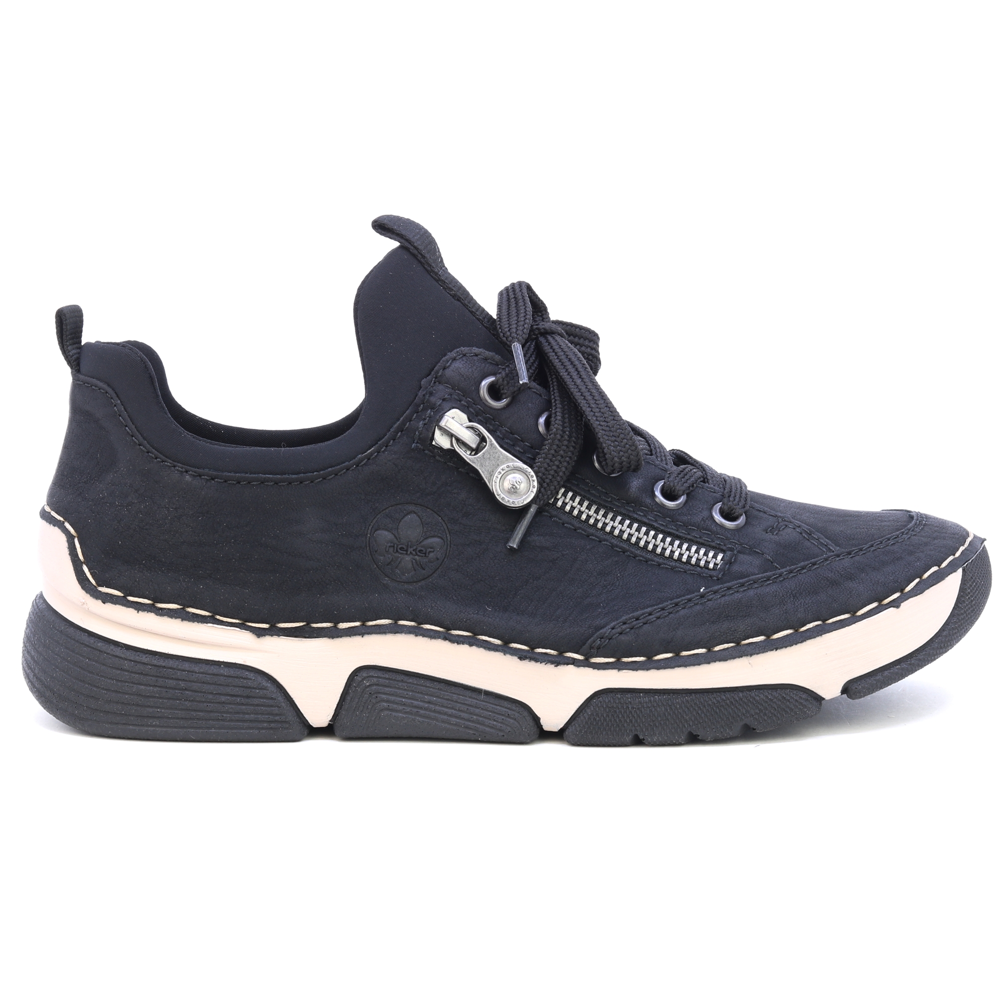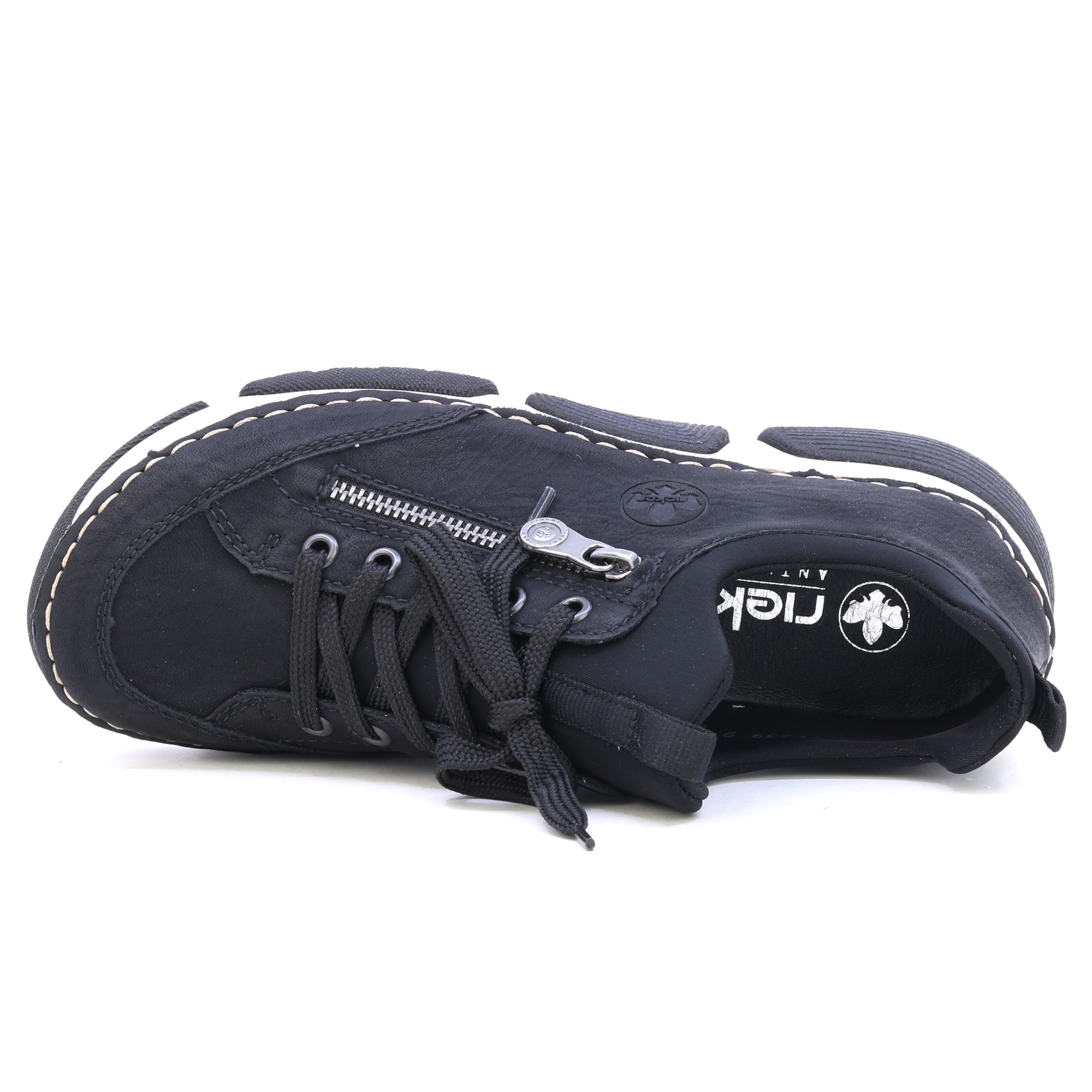 Černé tenisky od značky RIEKER s ozdobným zipem a vyrytým logem nabízejí kombinaci stylu a praktičnosti. Černý svršek kontrastuje s moderní podrážkou, která díky technologii tlumení nárazů poskytuje maximální komfort při chůzi. Kožená stélka zajišťuje příjemný pocit na noze, zatímco šněrování a pružný lem horního okraje umožňují snadné obouvání a perfektní přizpůsobení. Tyto tenisky jsou ideální volbou pro každodenní nošení, poskytující spolehlivou podporu a pohodlí po celý den. Technologie: Antistress: Tato technologie zaručuje lehkost, pružnost, prostornost a skvělou absorpci nárazů, čímž přispívá k pohodlnější chůzi.