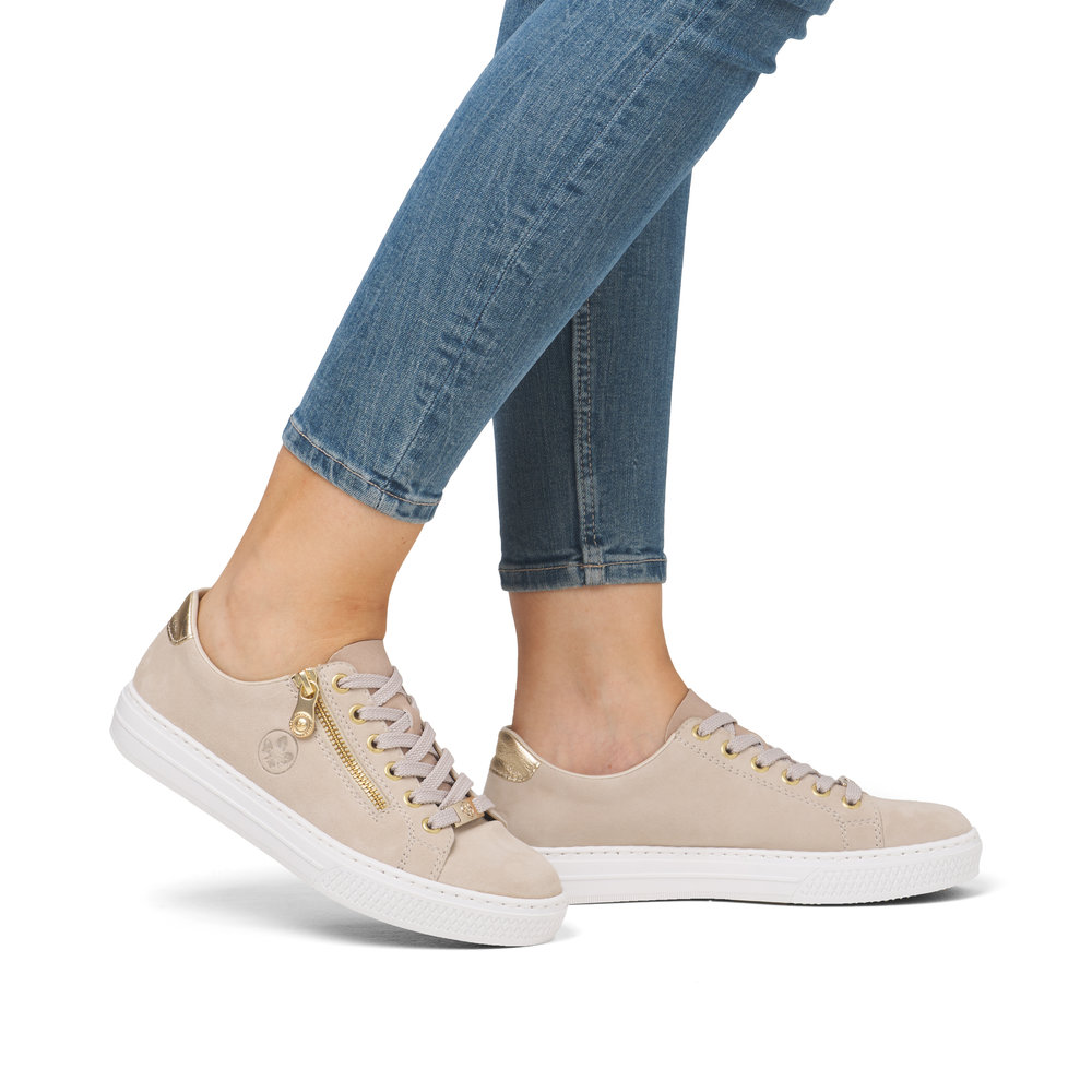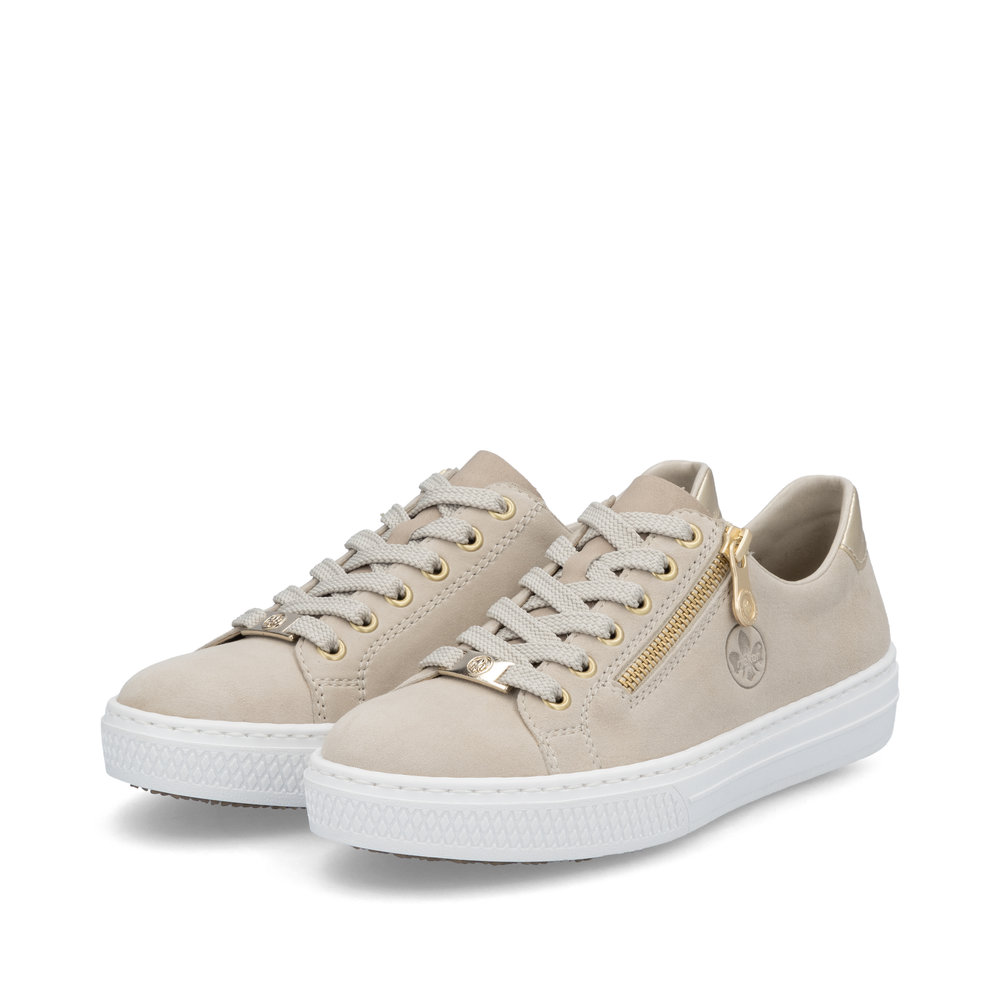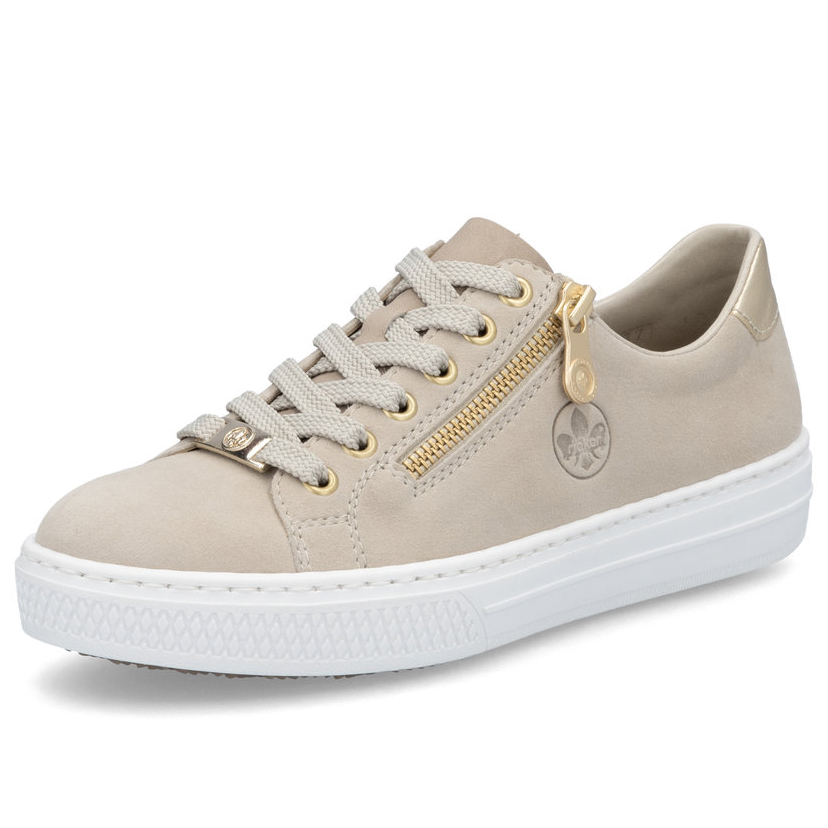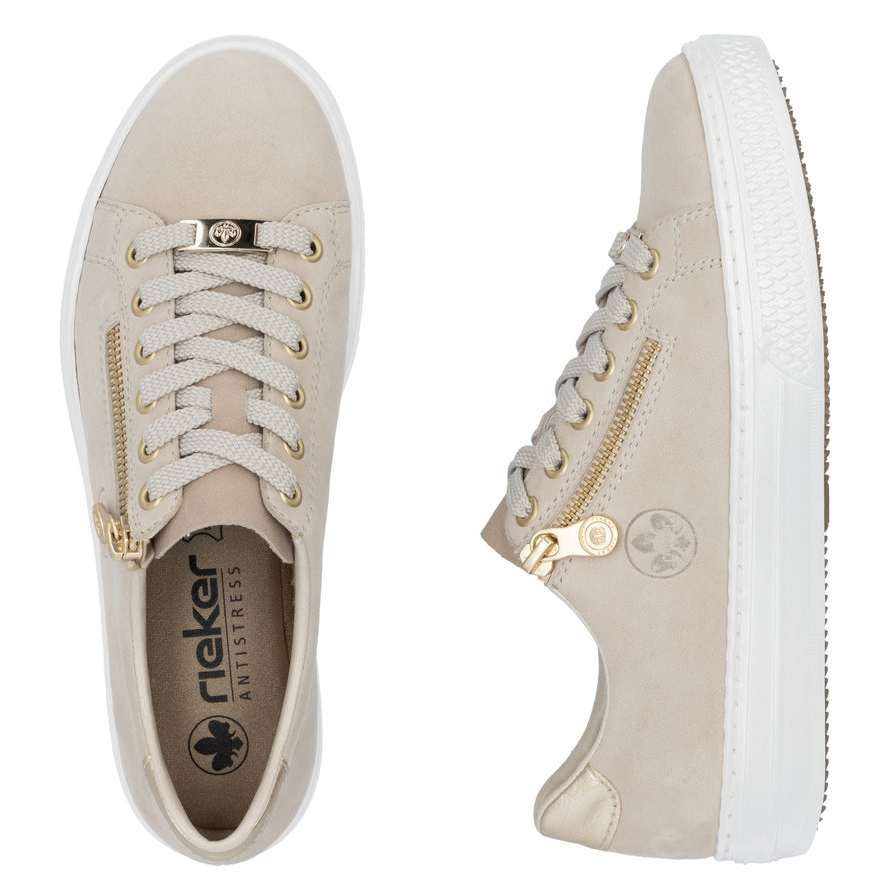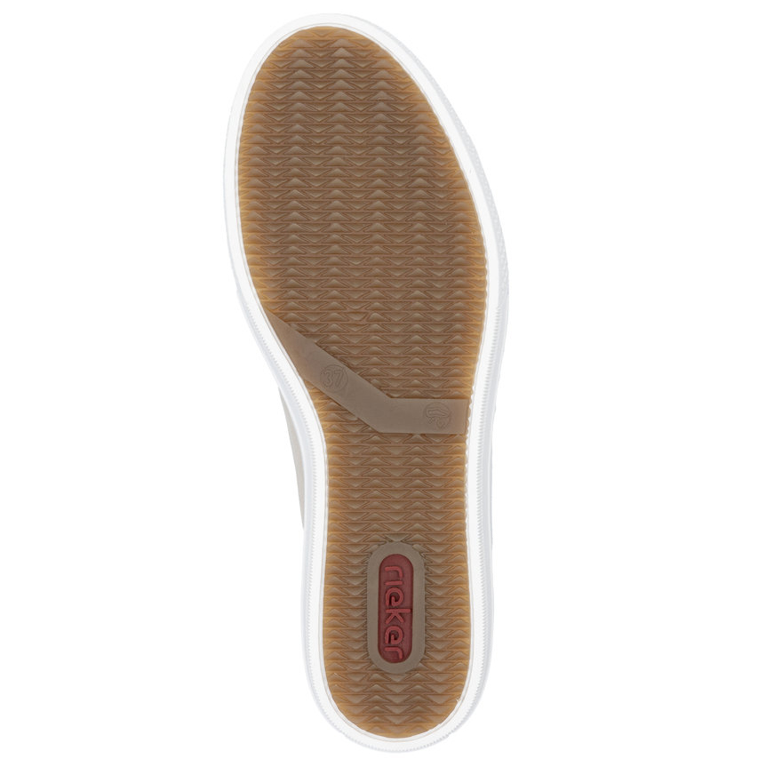 Dámská obuv značky RIEKER je nezbytným doplňkem každého šatníku, spojujícím eleganci, komfort a praktičnost. Tyto kožené tenisky v neutrální béžové barvě okouzlí svými jemnými odlesky na dekorativních prvcích, které jim dodávají sofistikovaný vzhled. Měkká stélka z paměťové pěny MemoSoft se dokonale přizpůsobí tvaru chodidla a zajistí maximální pohodlí po celý den. Praktický boční zip umožňuje snadné nazouvání, zatímco šněrování zajistí dokonalé přizpůsobení obuvi noze. Flexibilní podešev efektivně tlumí nárazy a poskytuje komfort i při celodenním nošení, což z těchto tenisek činí ideální volbu pro každodenní pochůzky, nákupy nebo volný čas. Technologie Antistress zajišťuje lehkost, pružnost a optimální oporu, díky čemuž bude každý váš krok příjemnější.