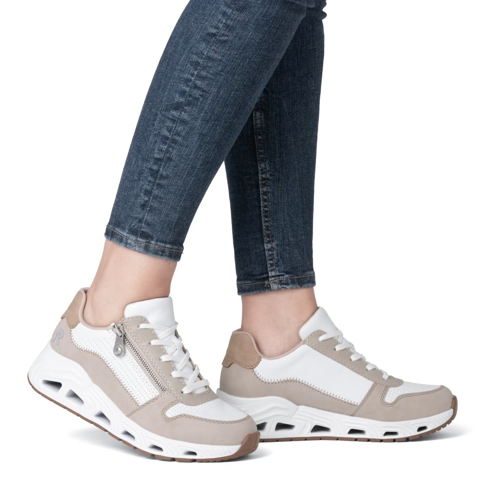 Super stylové, super in! To jsou tenisky RIEKER, které se stanou nepostradatelnou součástí vašeho šatníku. Světlý svršek je elegantně doplněn o bílé části a jemné prošívání, které dotváří jejich dokonalý vzhled. Funkční zip v kombinaci se šněrováním umožňuje snadné obouvání a přizpůsobení tvaru nohy. Unikátní lehká podrážka zajišťuje pohodlný došlap, zatímco vyjímatelná měkká stélka RiekerSoft poskytuje maximální komfort při každém kroku. Tyto stylové tenisky jsou ideální volbou pro každodenní nošení, ať už do města, na procházky nebo volnočasové aktivity. Kombinace moderního designu a inovativních technologií z nich dělá dokonalou obuv pro váš aktivní životní styl.
