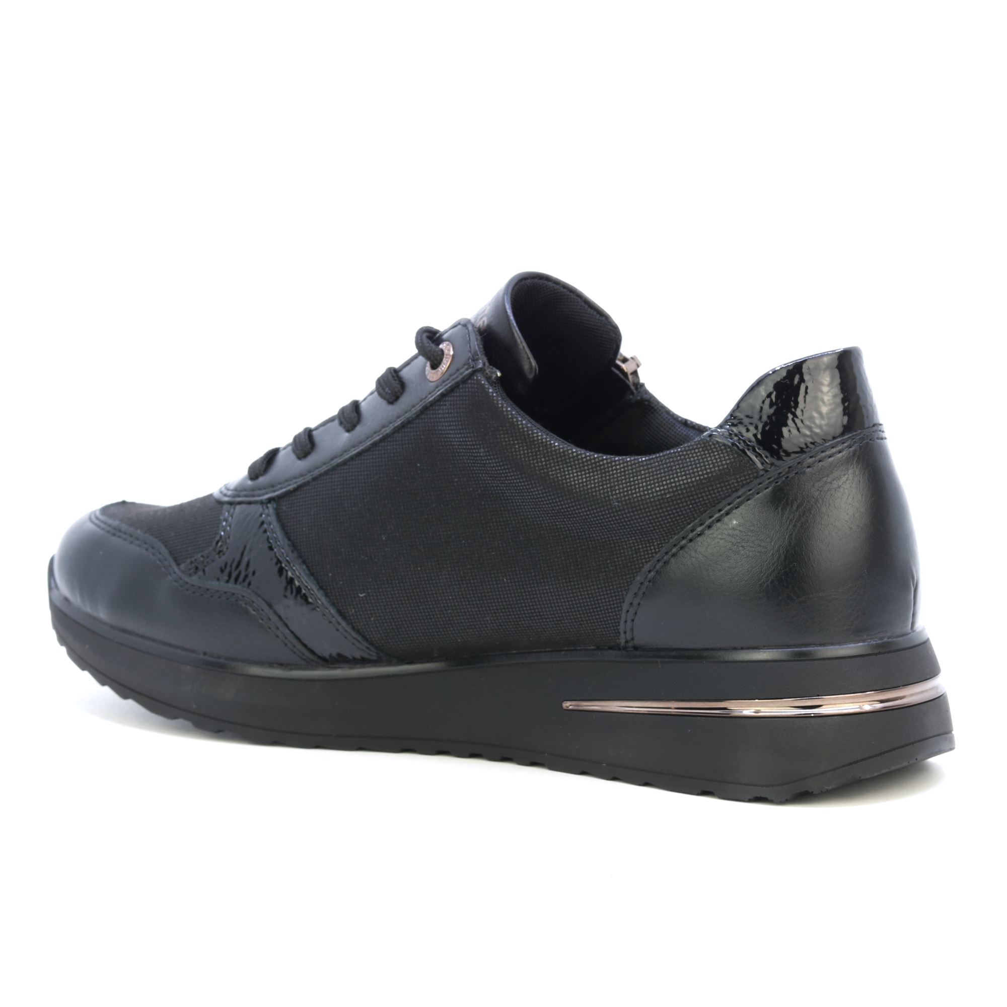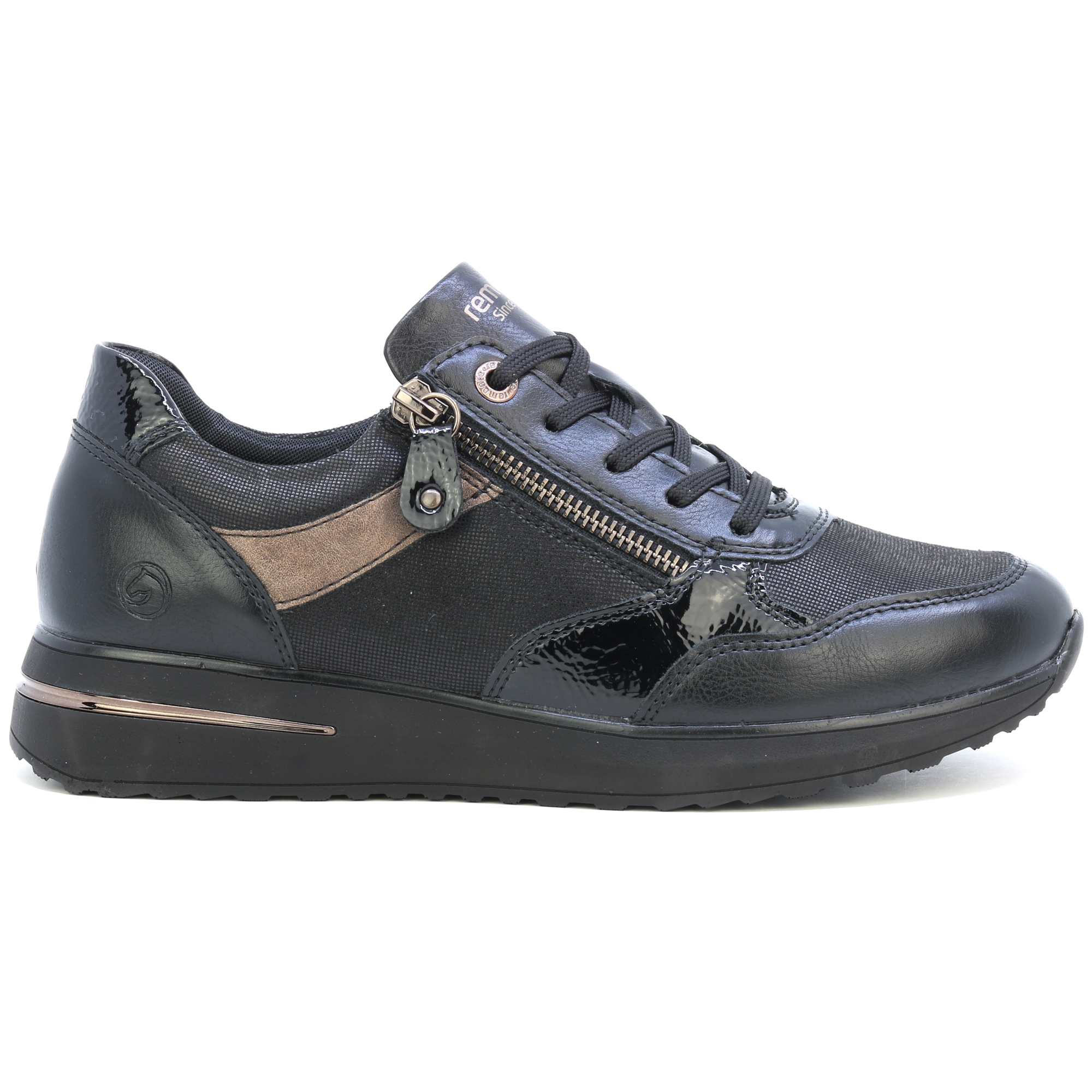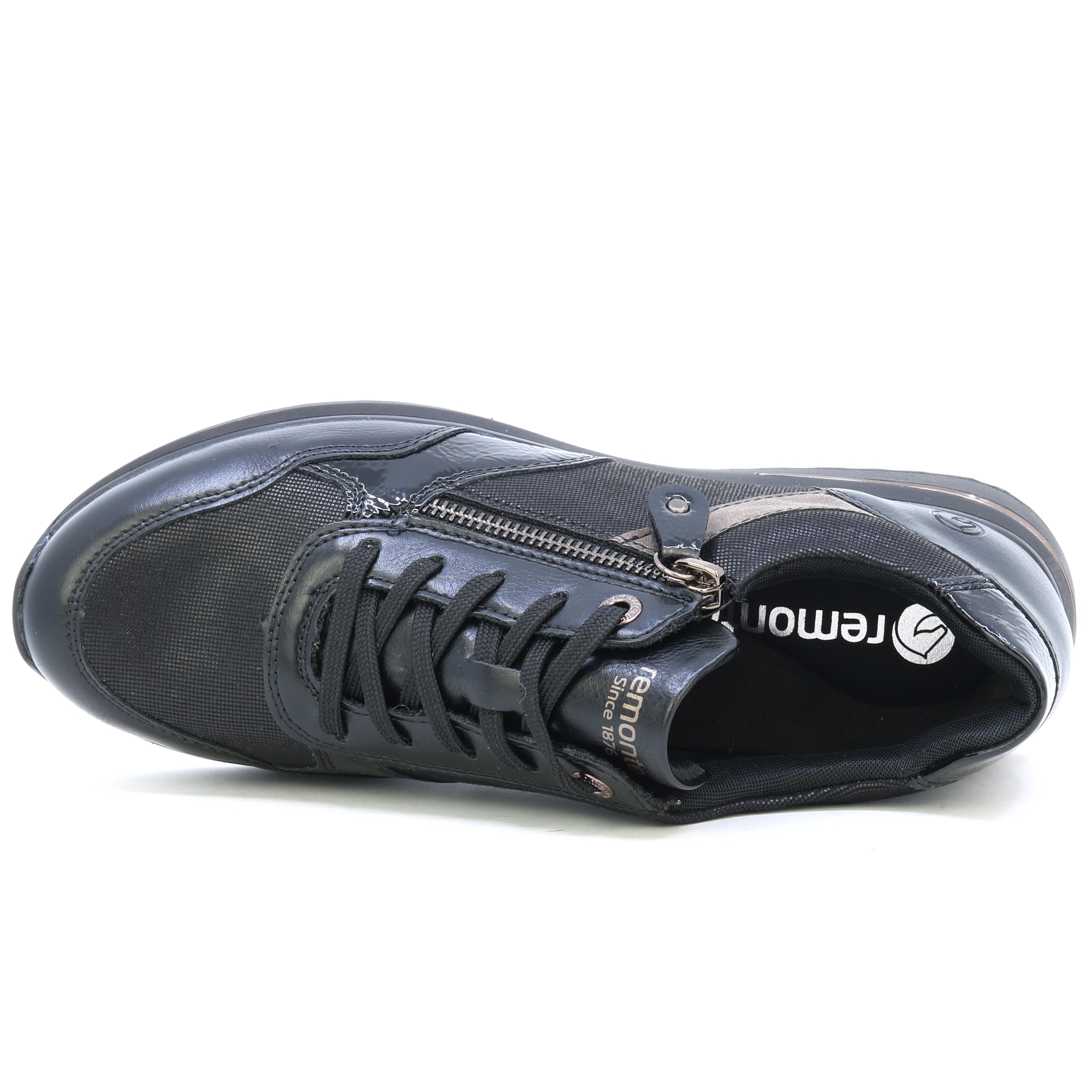 Obuv REMONTE je vyšší řadou značky RIEKER, obuv se vyznačuje kvalitou použitých materiálů. Tato dámská teniska Vás zaujme na první pohled svým svrškem černé barvy s kontrastními prvky a jemnými odlesky lakovaných částí. Díky šněrování a funkčnímu zipu na nártu se boty snadno obouvají a přizpůsobí se Vašemu chodidlu. Pro Vaše pohodlí na každém kroku je zde měkká stélka, která je zároveň i vyjímatelná. Tato obuv bude dobře vypadat s jakýmkoli oblečením z Vašeho šatníku ať už do práce nebo na procházku. Technologie: Remonte Soft – unikátní stélka vyrobená z prodyšného materiálu, která svým tvarem a materiálem zajistí pocit pohodlí při celodenním nošení.